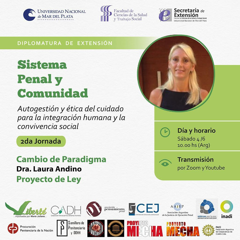 La 2da. Jornada del diplomado Internacional “Sistema Penal y Comunidad. Autogestión y ética del cuidado para la integración humana y la convivencia social”, se llevó a cabo el sábado 4 de junio a las 10:00 a.m. (Arg) 8:00 a.m. (Colombia) y estuvo a cargo de: Laura Andino.