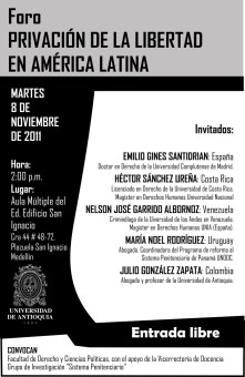 • Organizamos los foros “Privación de la libertad en América Latina” y “Derechos Humanos y derecho penitenciario en América Latina” en la Universidad de Antioquia y Universidad de San Buenaventura respectivamente.