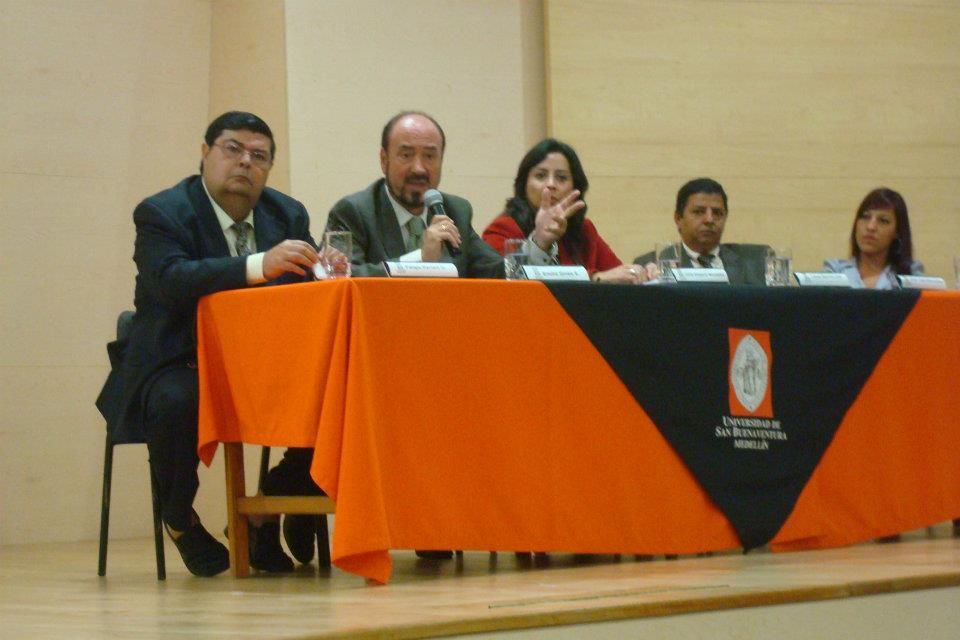 De izquierda a Derecha  nos acompañaron en la Universidad San Buenaventura: Felipe Renart García (España), Emilio Guines Santidrian (España),  Julia Victoria Montaño (Decana Derecho USB), Jhon Jairo Bermudez Garcés (Personero de Bello) y Kenia Lorena Gómez (Semillero de Derecho Penitenciario).