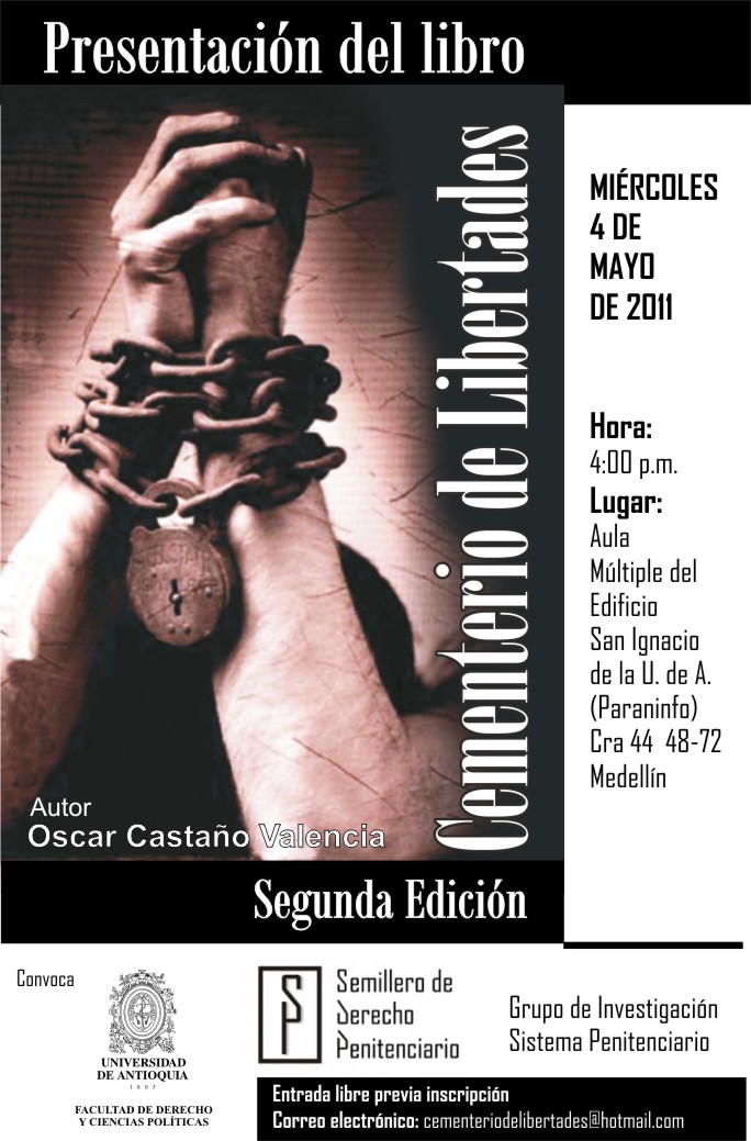 El grupo de Investigación Sistema Penitenciario de la Facultad de Derecho y Ciencias Políticas de la Universidad de Antioquia y el Semillero de Derecho Penitenciario organizan el evento de lanzamiento del libro Cementerio de Libertades del periodista Oscar Castaño Valencia, esta segunda edición es prologada por el Prof. Dr. Juan David Posada Segura.