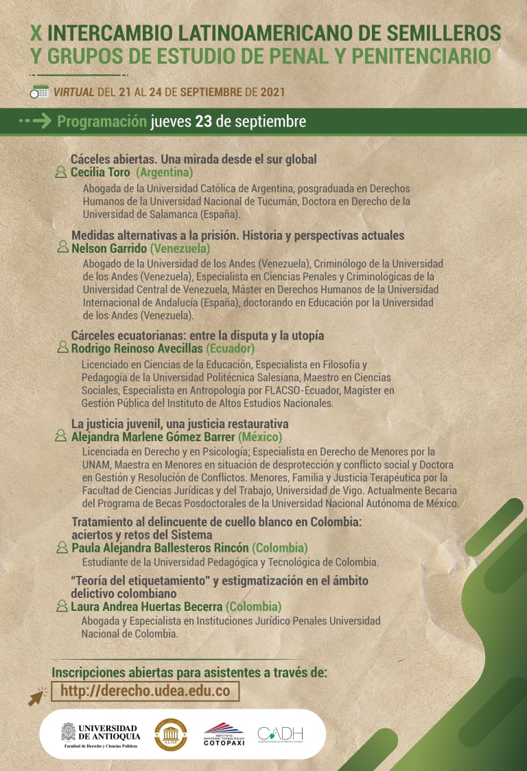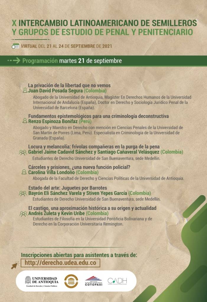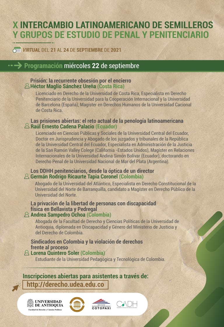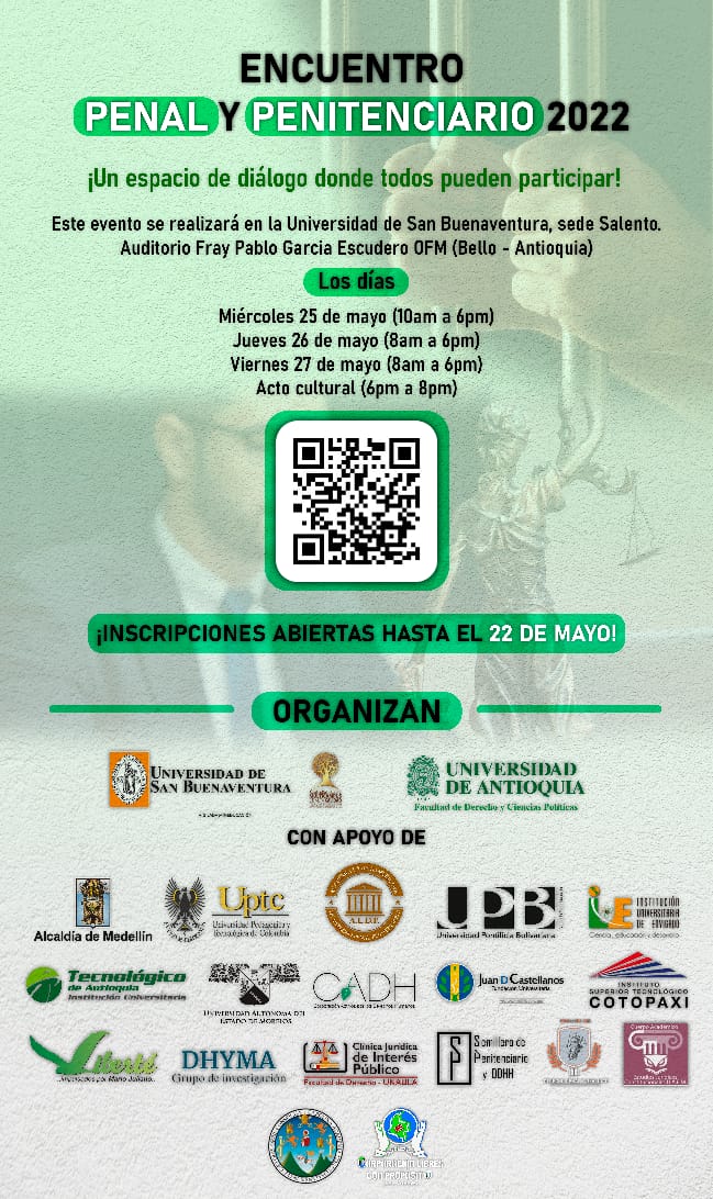 Hasta el 22 de mayo estarán abiertas las inscripciones para participar en nuestro Encuentro Penal y Penitenciario 2022, que este año se celebrará de manera presencial en la sede Salento de la Universidad de San Buenaventura en Bello Antioquia; tendremos 62 ponencias, de 5 países (Argentina, Colombia, Ecuador, Guatemala y México) por parte de estudiantes, personas en privación de la libertad, profesores, funcionarios, miembros de organizaciones sociales, etc.